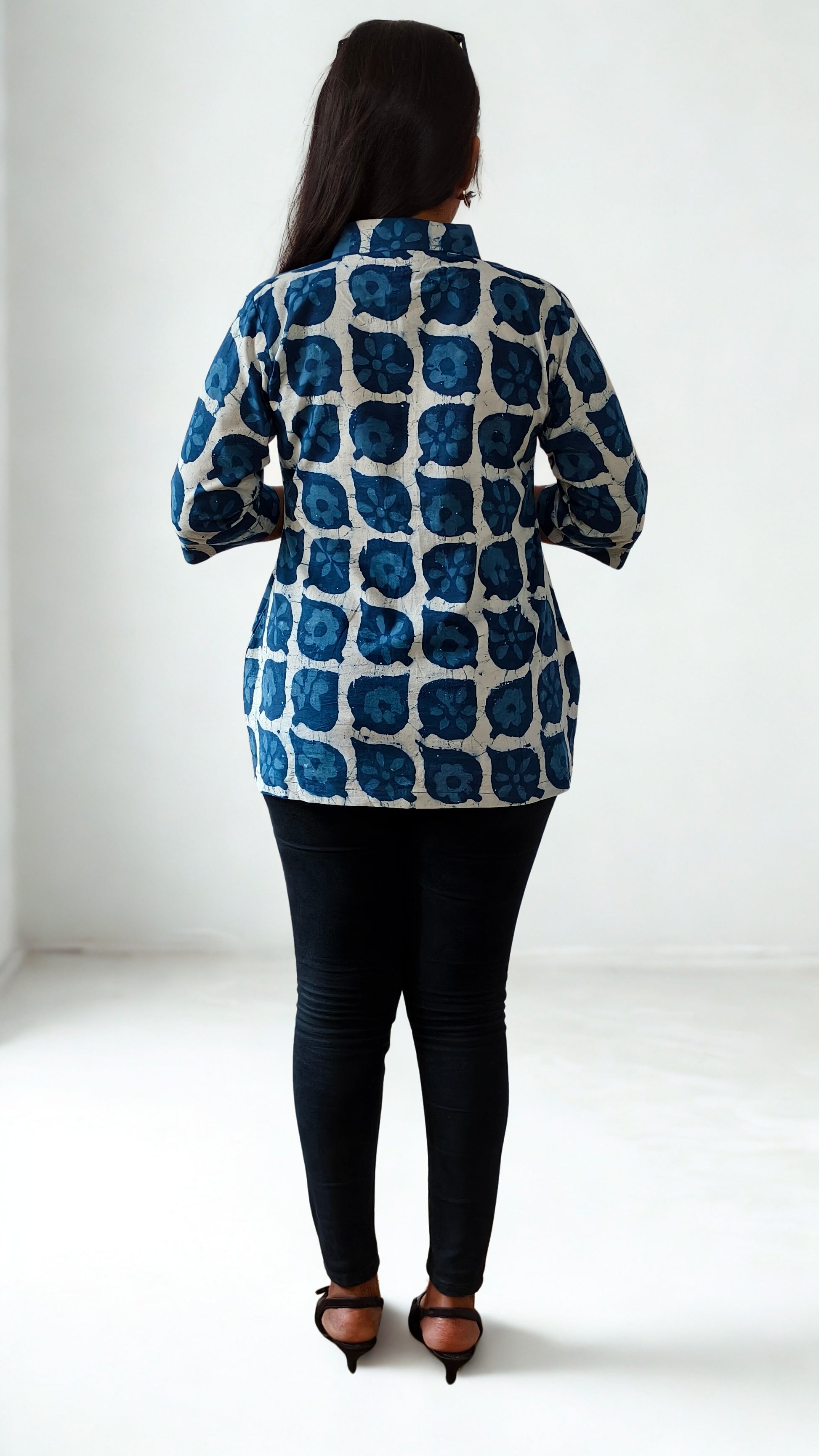 This indigo shirt showcases nature-inspired leaf motifs and comfortable three-fourth sleeves. Minimalist yet artistic, it’s ideal for casual outings or creative layering.
