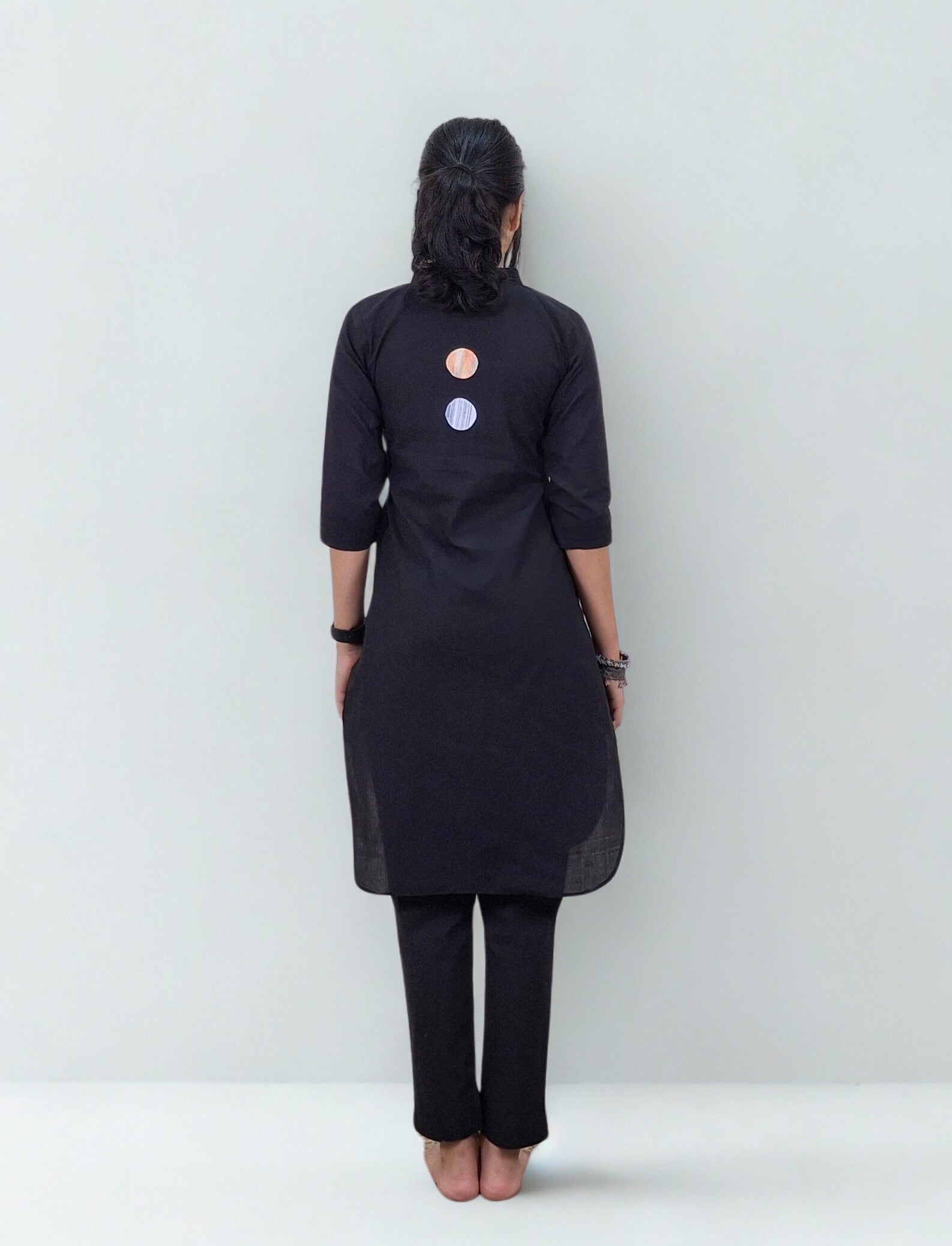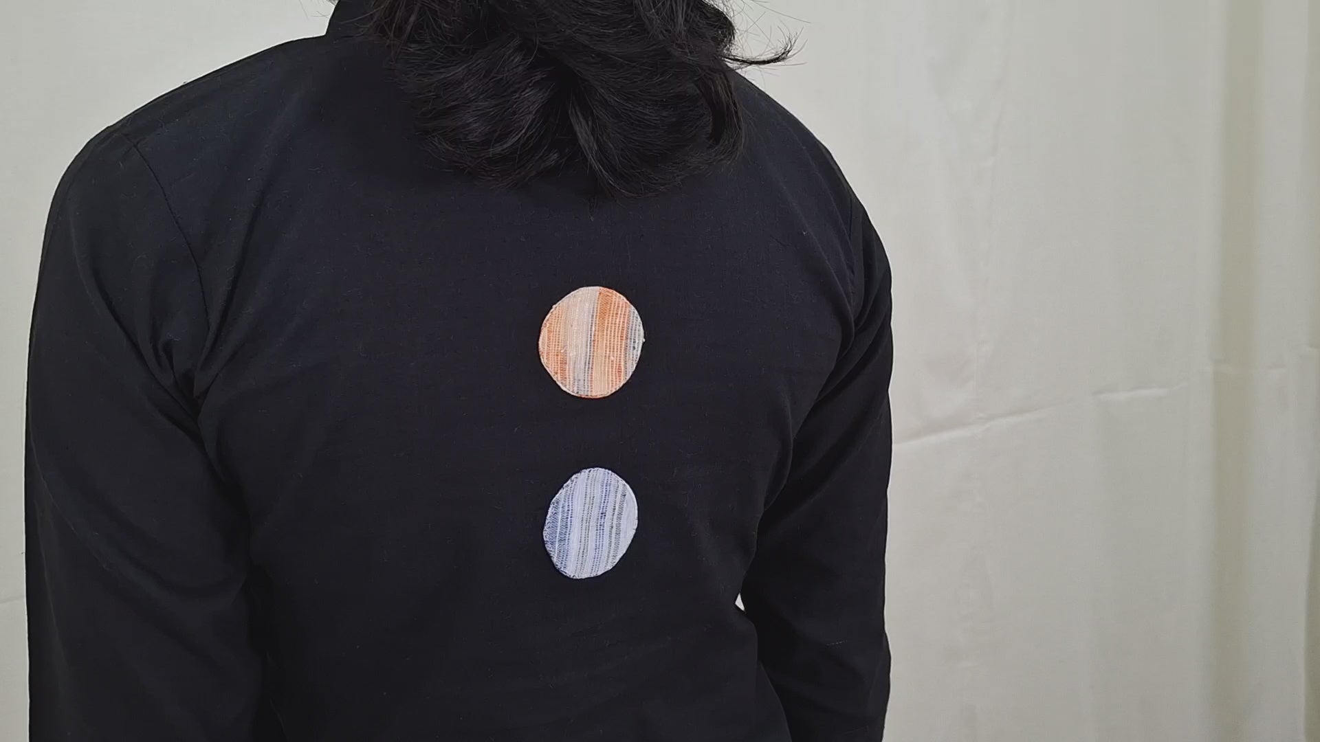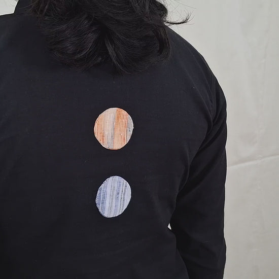 This black co ord with apple-cut top is crafted from handloom cotton, featuring three-fourth sleeves and unique khadi patchwork circles—in dual colour on the front and two smaller ones at the back. Lightweight, breathable, and artisanal, it offers a contemporary silhouette while celebrating traditional craftsmanship.