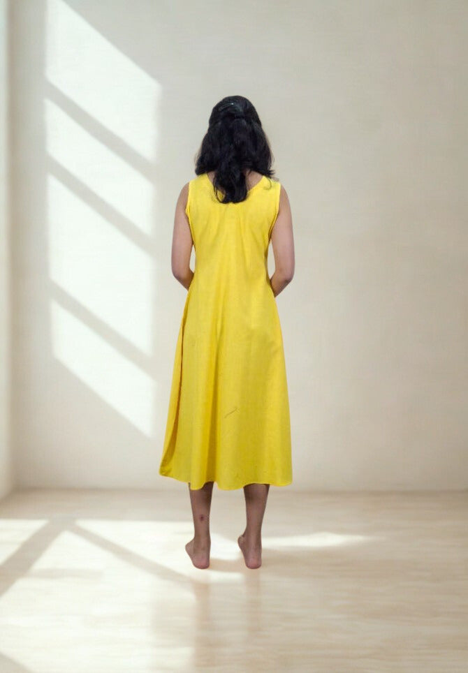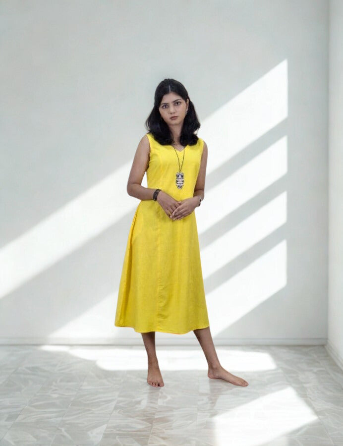 Crafted in premium hand-spun, hand-woven fabric, this yellow one-piece features a breezy sleeveless design with a graceful boat neck. Practical side pockets add everyday functionality, while the soft, artisanal fabric brings effortless charm and timeless elegance—perfect for casual outings or relaxed gatherings.