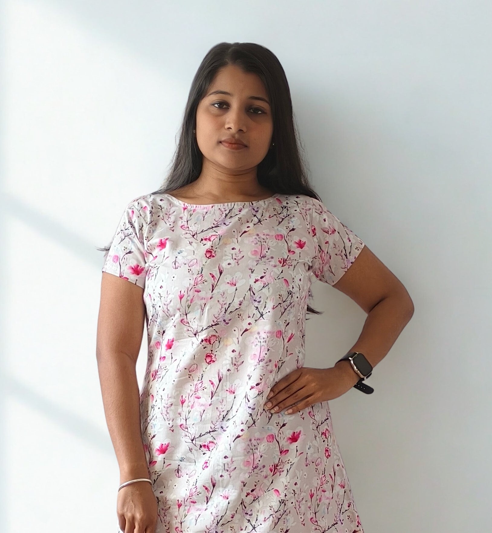 This jam cotton one-piece in delicate pink is adorned with vibrant floral digital prints. It has functional pocket as well for convenience. Lightweight, breathable, and easy to style, it’s perfect for casual outings, brunches, or everyday wear. Pair with minimal accessories for a fresh, effortless look.
