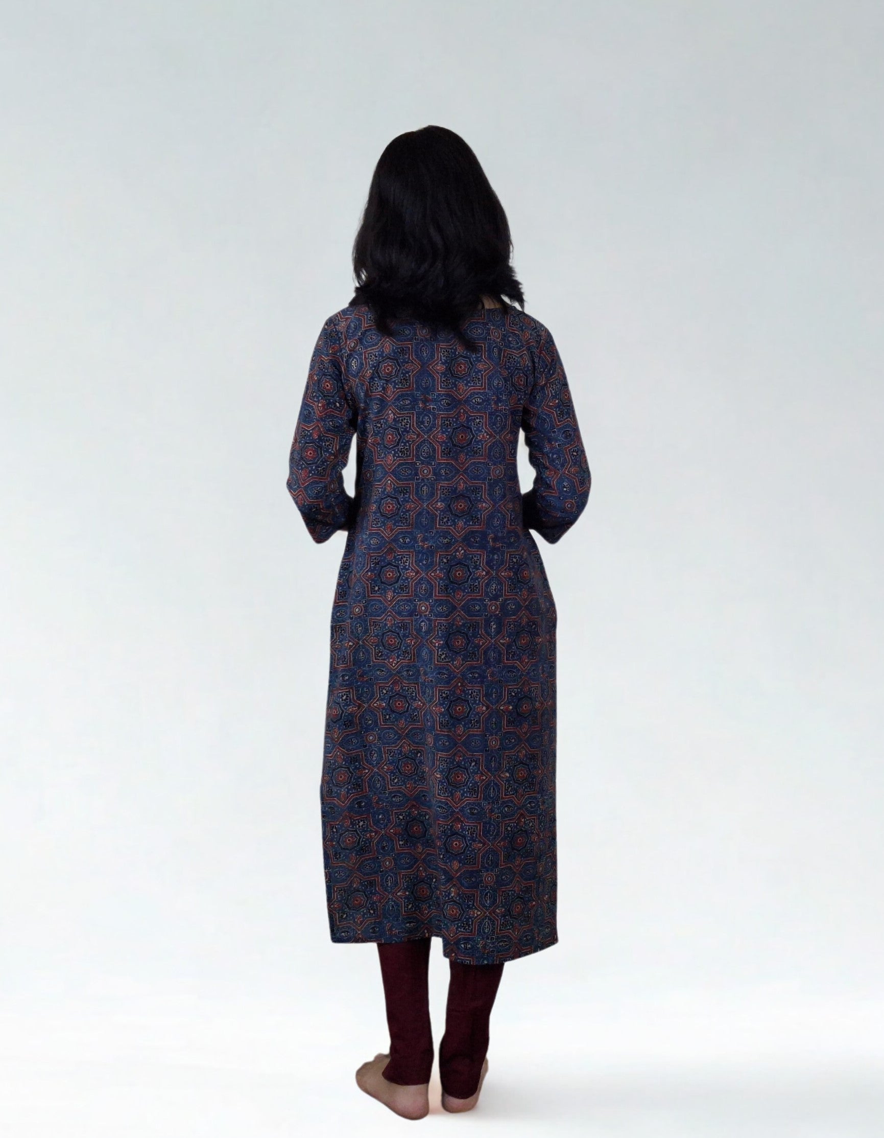 Crafted in natural fabric, this blue handblock kurti features a traditional block print design with a refined boat neckline. Three-fourth sleeves and functional side pockets add comfort and practicality, making it a versatile choice for everyday wear or casual outings