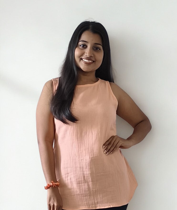 Crafted from 100% organic cotton, this sleeveless short top in soft peach embodies simplicity and sustainability. Lightweight and airy, it’s perfect for warm days, casual outings, or layering under jackets