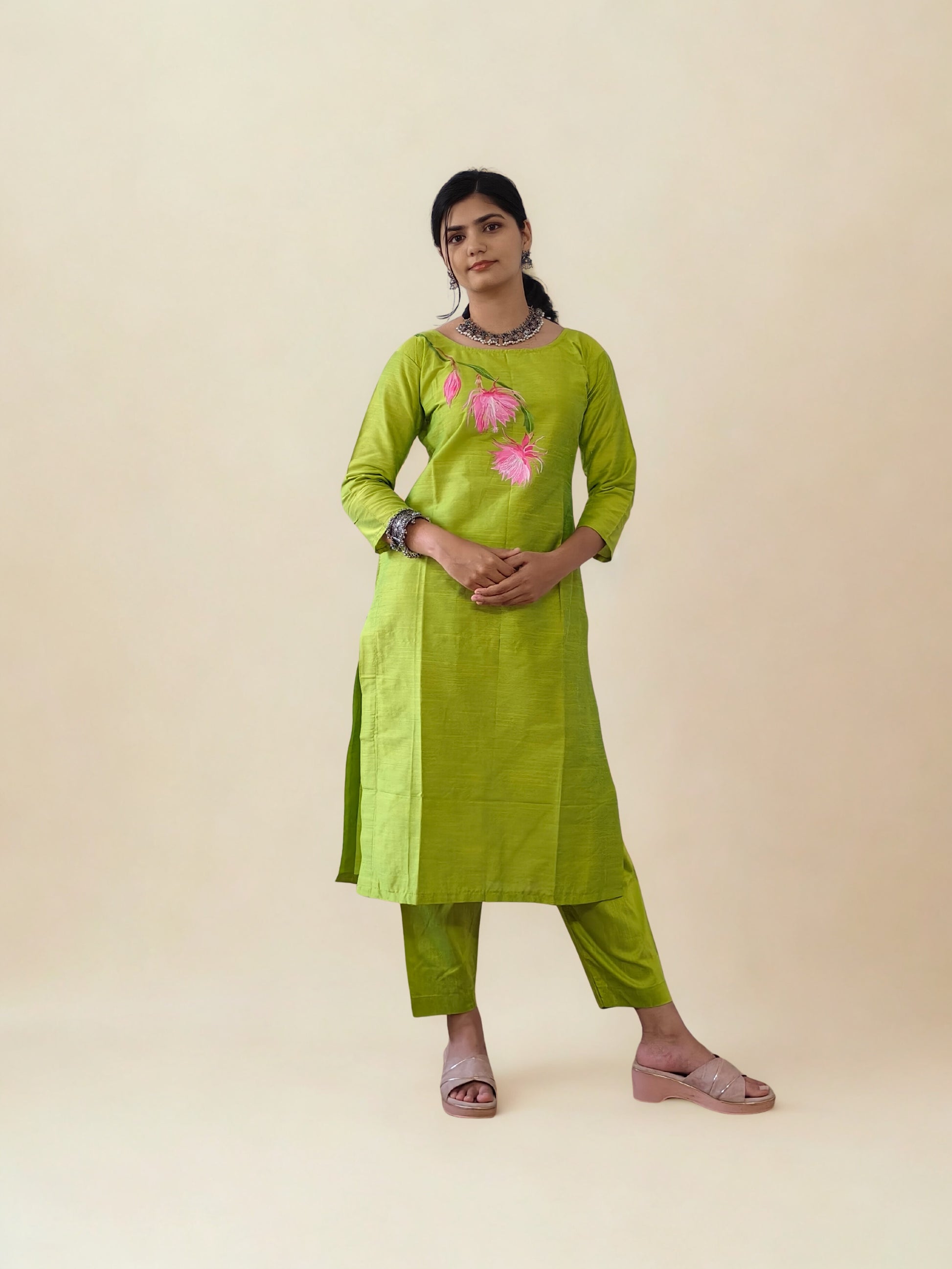 Make a striking statement in this premium Neon green semi raw silk kurti, blending vibrance with elegance. Designed with a boat neckline, three-fourth sleeves, and a single pocket, it offers a chic yet comfortable fit. The highlight is the hand-painted pink Brahma Kamal motif, adding a touch of artistic luxury to this graceful piece. Perfect for festive gatherings, day events, or family functions. This neon green semi raw silk kurti brings together vibrance and elegance, making it ideal for occasions where you want to look graceful yet effortlessly stylish.